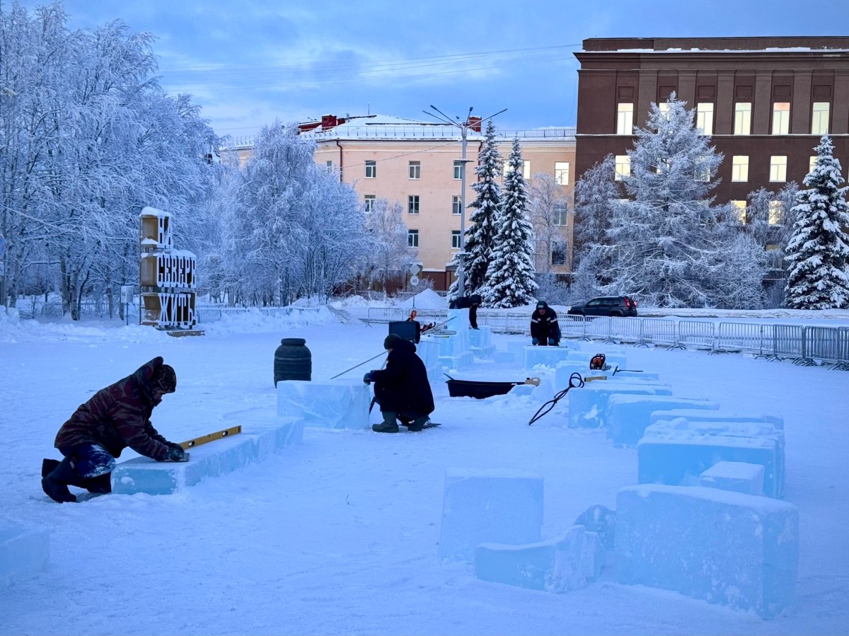 Сейчас на площади Ленина в Апатитах уже установлены ледяные заготовки для создания будущих скульптур. Напомним, за 90 минут во время конкурса художники с помощью бензопил превратят огромные куски льда в оригинальные полутораметровые ледовые композиции.