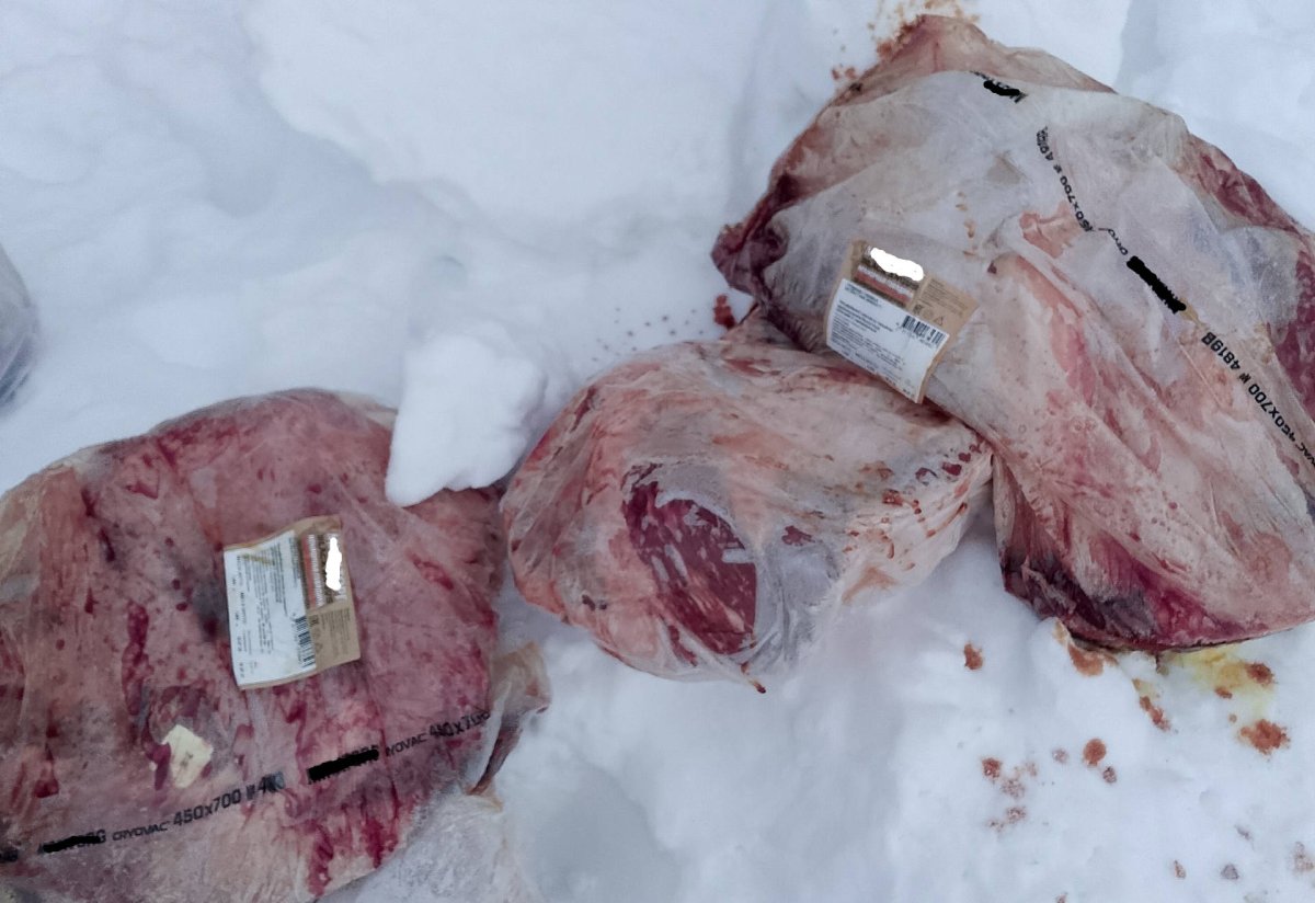 На опубликованных фотографиях видно, что несколько пакетов с мясом валяются прямо на снегу.