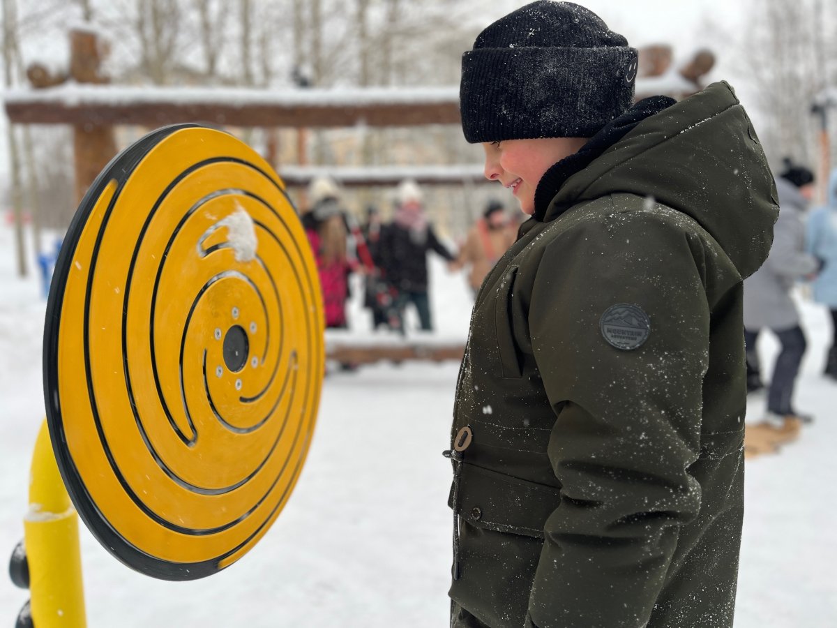 На площадке есть так называемые «оптические диски». Это плоские жёлтые круги, которые вращаются. Когда на них смотришь, то создаются зрительные иллюзии. Детвору не оторвать от стола с игровым лабиринтом и качелей с канатом. Посещение игривой зоны — бесплатное.