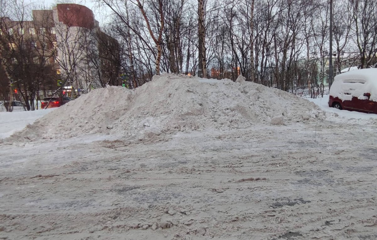 «Свалили на стоянку»: в Мурманске возле сквера «Солнечный» после уборки выросла гора снега