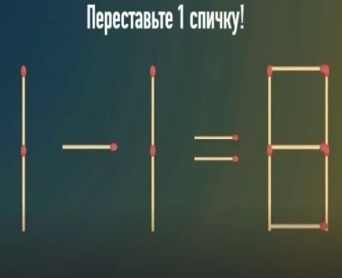 Перед нами пример: 1-1=8. нужно переставить одну спичку, чтобы равенство получилось верным.