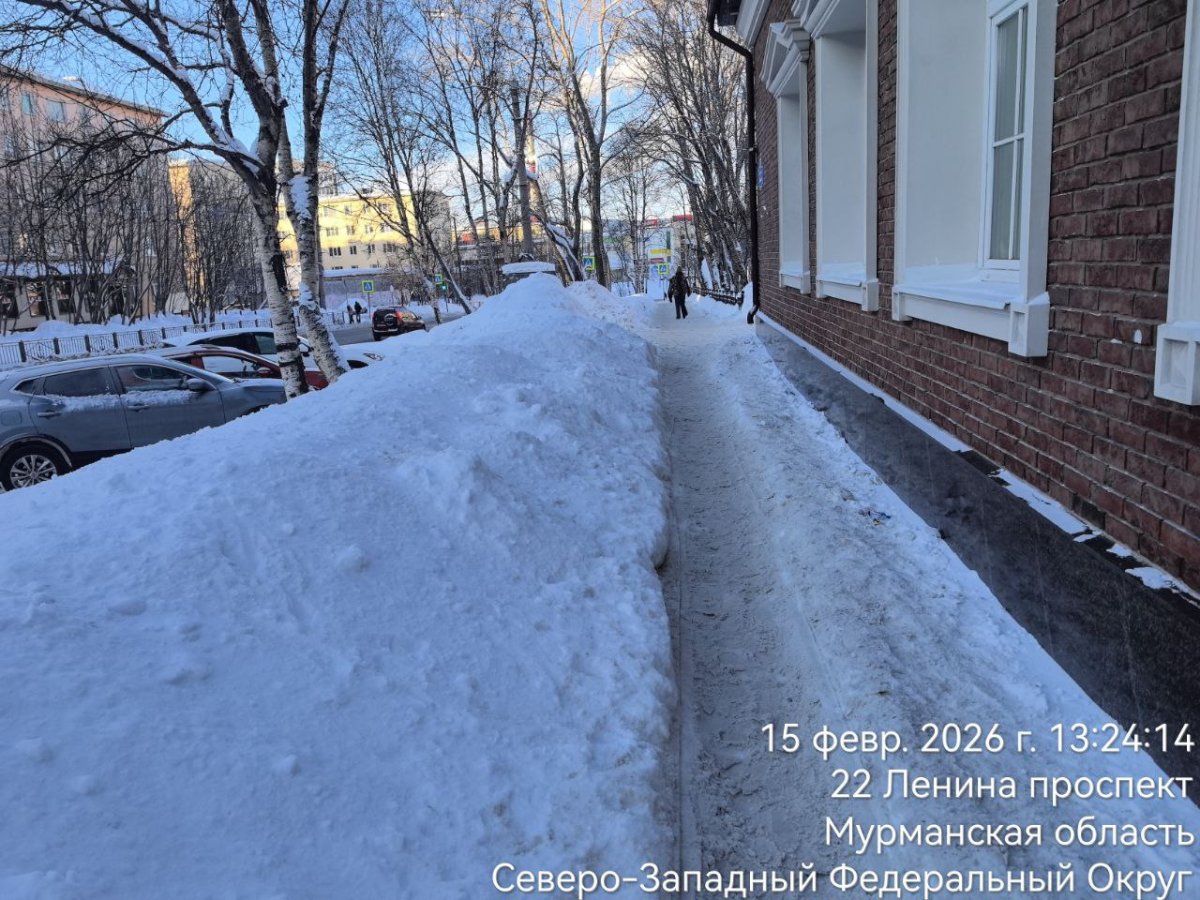 Тротуар по проспекту Ленина вдоль театра кукол в Мурманске замело снегом — люди вынуждены втискиваться в узкую тропинку. Об этом сообщили жители областного центра. Фотографии заметённого участка проспекта опубликовала в чате мэра города мурманчанка Елена.