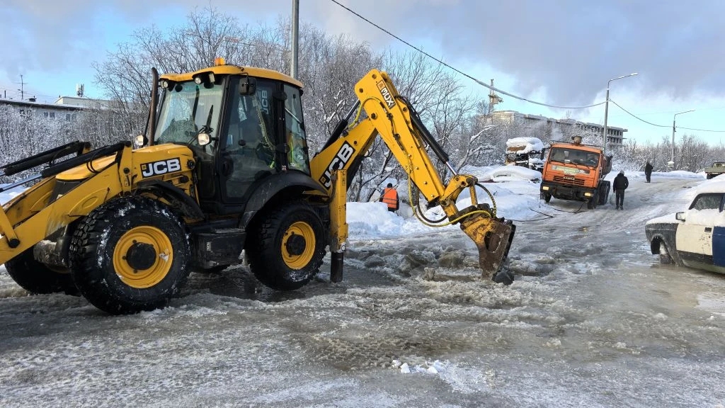 В Мурманске дорогу на Героев Рыбачьего начало топить озеро — коммунальщики вручную долбили замерзшую ливневку