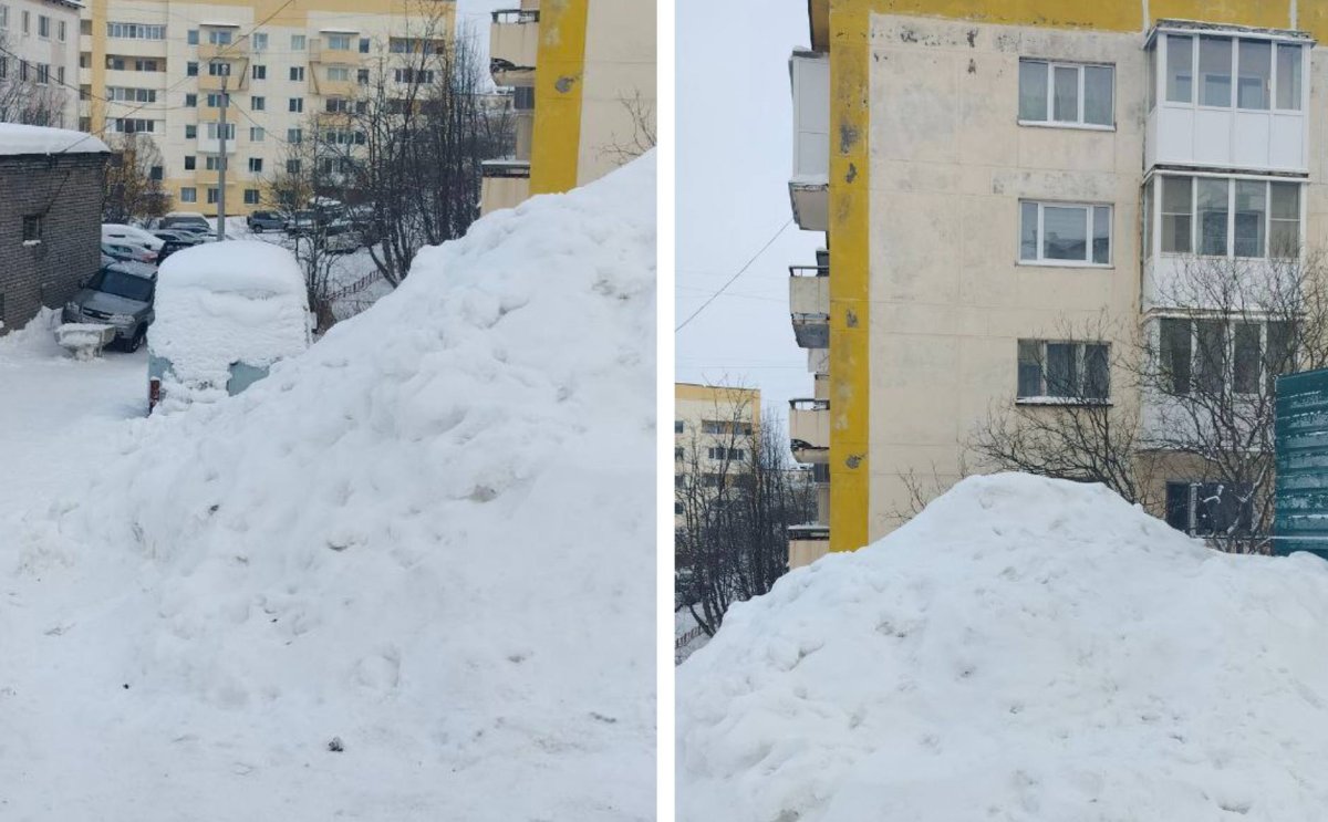 «Нагребли за зиму!»: в Заполярном снежная гора закрыла окна второго этажа, а вывозить её не спешат