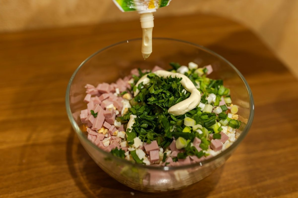 Добавляем майонез. Здесь все зависит от вкусовых предпочтений: одни любят «пожирнее и погуще», другие — чтобы только слегка пропитать сухарики. Снова перемешиваем.