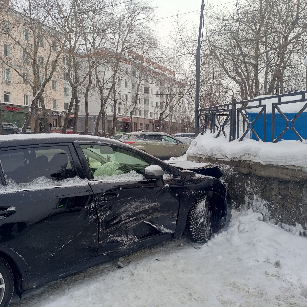 Сегодня утром в центре Мурманска столкнулись два автомобиля. Авария произошла прямо напротив железнодорожного вокзала, на перекрёстке улиц Коминтерна и Воровского. Одна иномарка влетела в бок другой. От удара автомобиль откинуло в каменный забор.
