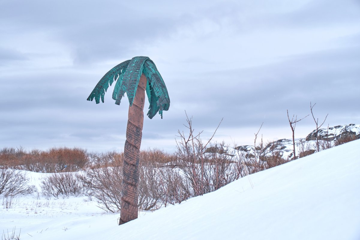 В Лиинахамари местным пальмам не страшны ни морозы и метель, ни жара и дожди. Дело в том, что на этом побережье Баренцева моря экзотические деревья — не настоящие. Сделаны они из старых покрышек. Кто автор композиции — неизвестно, но постарался он на славу.