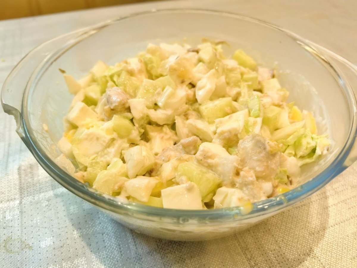 Салат заправляется майонезом. Для данной раскладки ингредиентов достаточно 50 г майонеза. Блюдо следует хорошо перемешать.