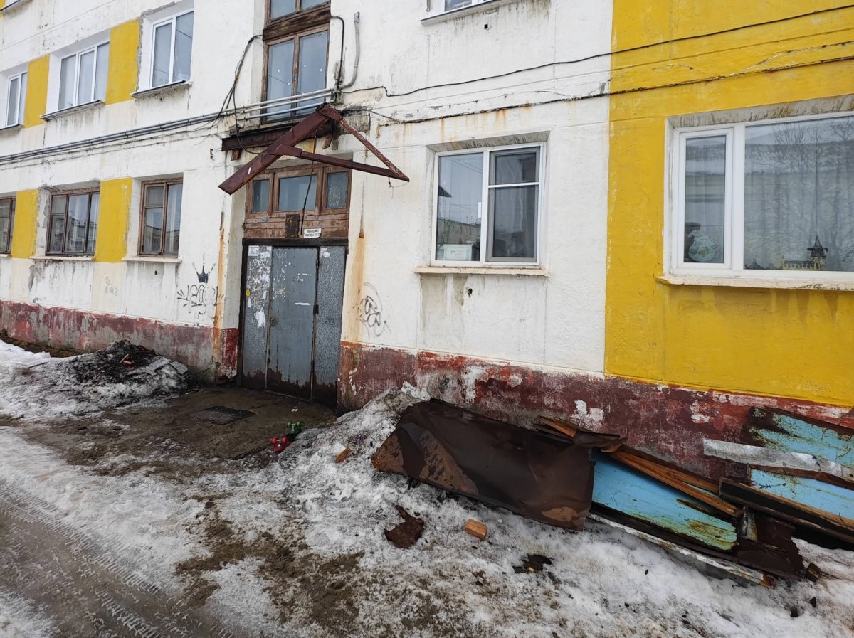 Не пережил весну: В Заполярном у дома на Шмакова рухнул подъездный козырёк