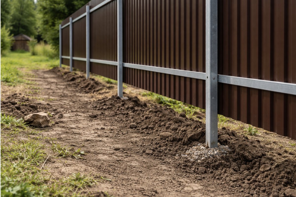 На нестабильных грунтах, при высоких водах или под тяжёлые конструкции без бетонирования не обойтись. В таких случаях используют либо классическую заливку, либо ленточный фундамент. Игнорирование этого правила приводит к перекосам и разрушению забора уже в первые годы.