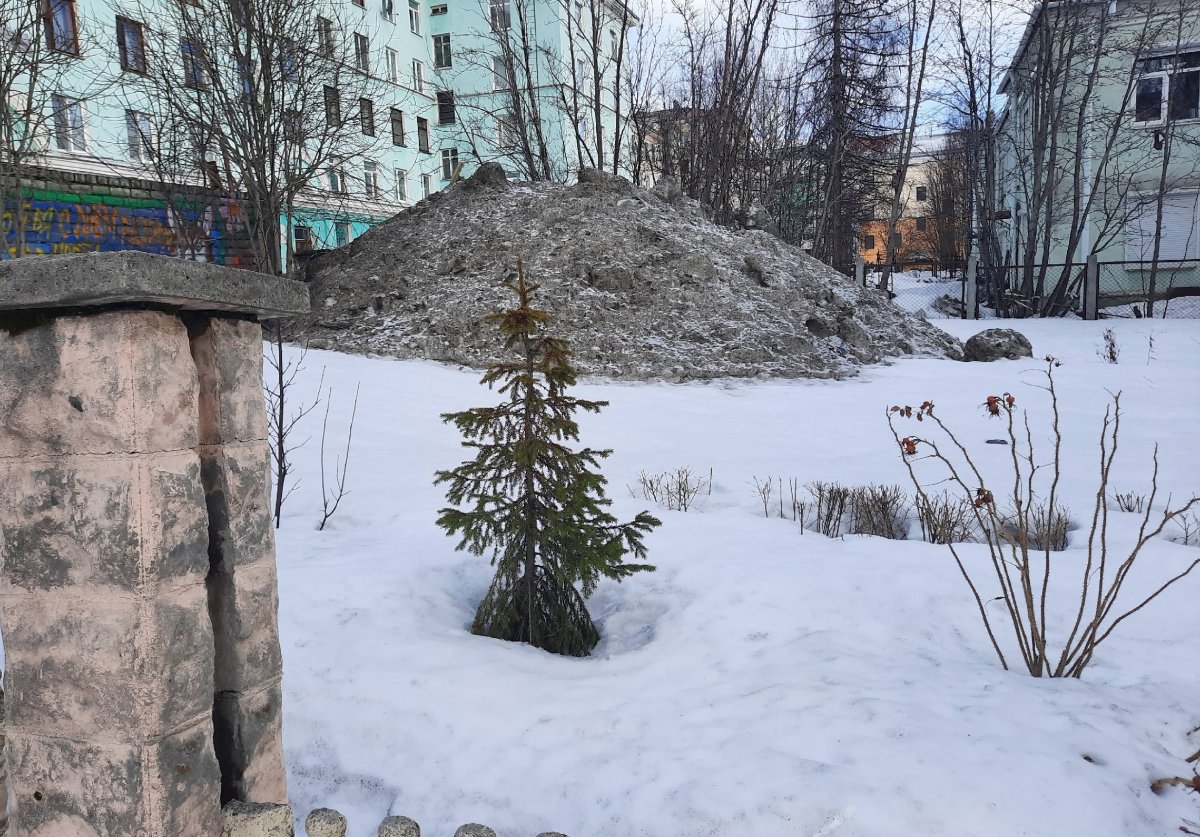 — Пятый год подряд УК «Наш дом» сваливает снег с территории дома Сомова д. 11 в наш палисадник. Каждый раз надеемся, что снег сваливать не будут и сажаем декоративные кустарники и цветы, — пожаловалась мурманчанка Светлана Водопьянова.