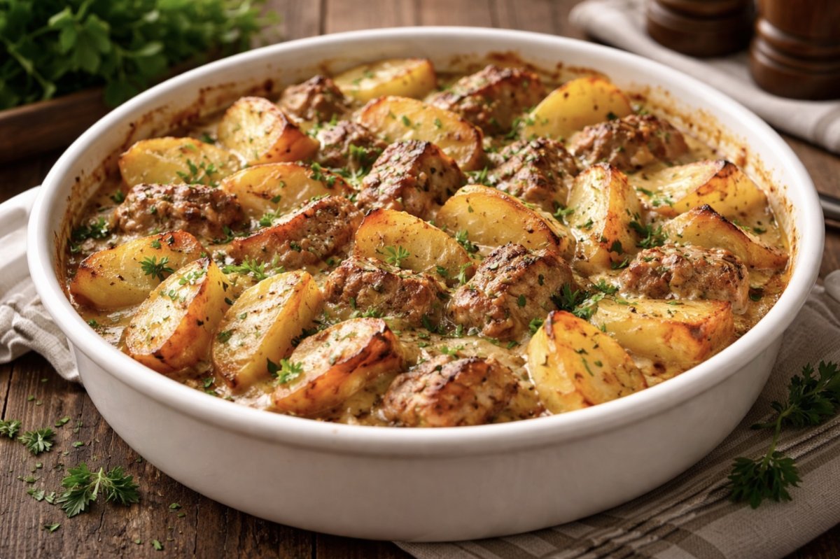 Автор популярного кулинарного блога Наталья делится рецептом простого, но очень вкусного ужина, который не требует долгой готовки. Это блюдо — настоящая находка для занятых: всё нарезали, смешали и отправили в духовку. В результате получается ароматный картофель и сочное мясо, пропитанное сливочным соусом.