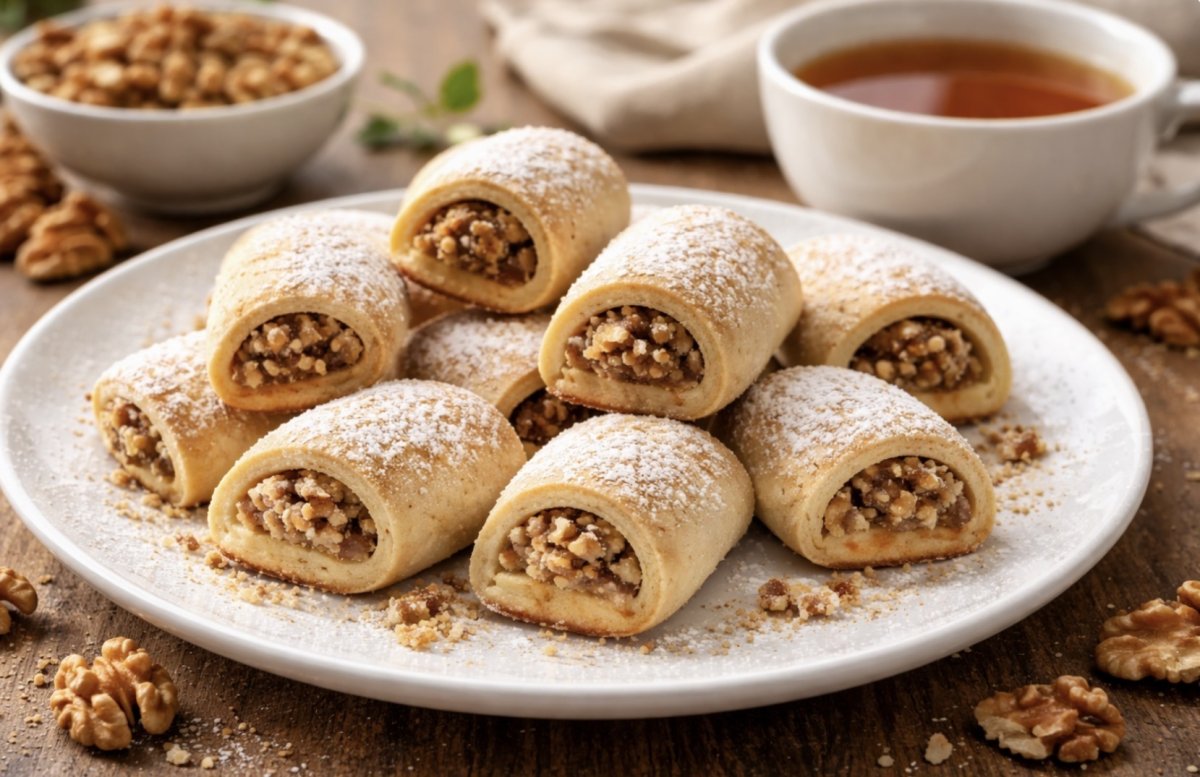 Форма у печенья простая — аккуратные рулетики с начинкой внутри. После выпечки они получаются рассыпчатыми, но при этом отлично держат форму.