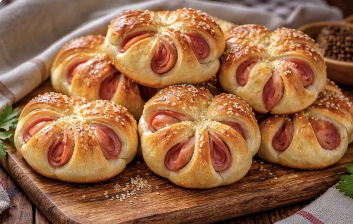 Начинка максимально простая — варёная колбаса, нарезанная кружочками. Но главный секрет — в сборке. Каждая булочка состоит из нескольких слоёв: тесто, колбаса, снова тесто. В итоге получается эффектная структура и насыщенный вкус.