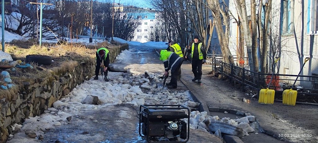 — Освободили из ледяного плена дворовый проезд на Красном Горне, 3. Образовавшуюся толщу льда дробили вручную, а затем зачистили двор от тонн расколотой замороженной воды, — рассказали полярнинские дорожники.