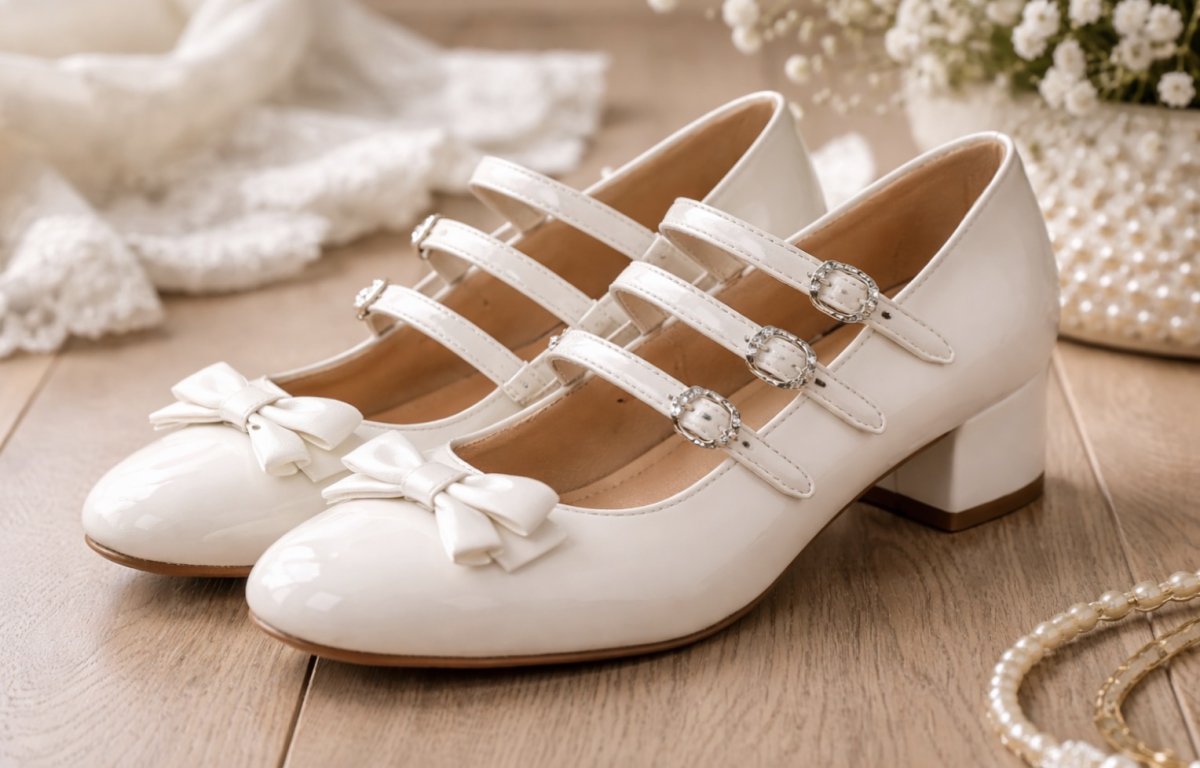 Туфли с V-образным вырезом визуально удлиняют ноги, а обновлённые Мэри-Джейн с несколькими ремешками добавляют образу выразительности.