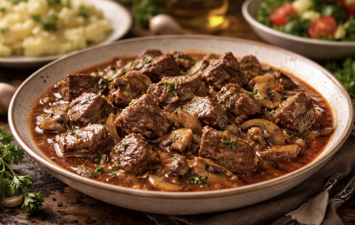 Блюдо получается универсальным: его можно подавать с картофелем, рисом, макаронами или гречкой. Соус насыщенный, поэтому гарнир лучше делать простым. А свежие овощи или соленья отлично дополнят вкус.