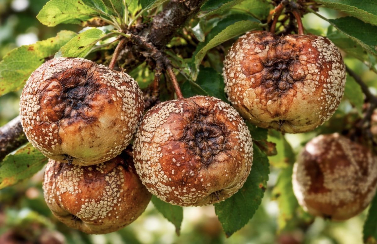 Монилиоз, или плодовая гниль, вызывается грибом Monilia fructigena и поражает не только яблони, но и другие плодовые деревья. Он легко распространяется через дождь, ветер, насекомых и даже мелкие повреждения на плодах. Особенно активно болезнь развивается в тёплую и влажную погоду.