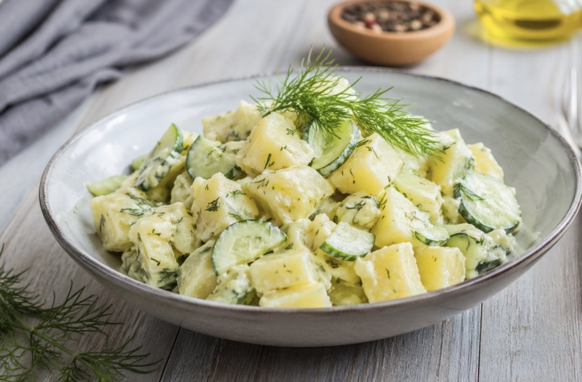 Первый вариант — классический картофельный салат с огурцами. Запечённый картофель нарезают кубиками, добавляют нарезанный лук, маринованные или солёные огурцы и свежий укроп. Всё заправляют ароматным нерафинированным подсолнечным маслом, при желании добавляют немного горчицы. Получается простой, но очень гармоничный вкус: мягкий картофель, хрустящие огурцы и пикантный лук.