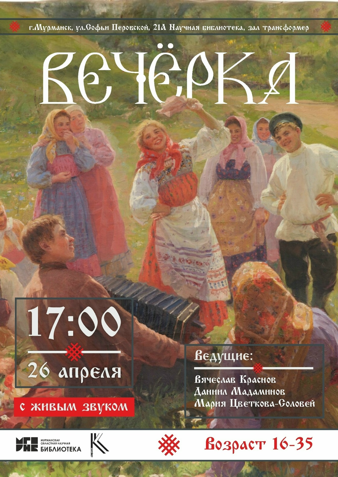 Зажигательные танцы, песни хором и народные игры создадут особую атмосферу в Мурманской научной библиотеке 26 апреляя, во время молодёжной «Вечерки» (16+). Организаторы обещают не только живую музыку, но и море веселья. Прийти можно даже в спортивном костюме.